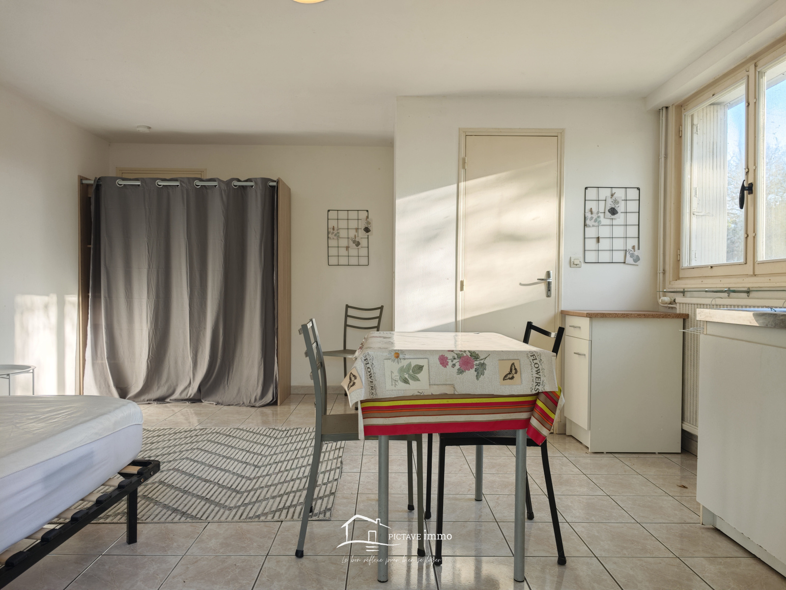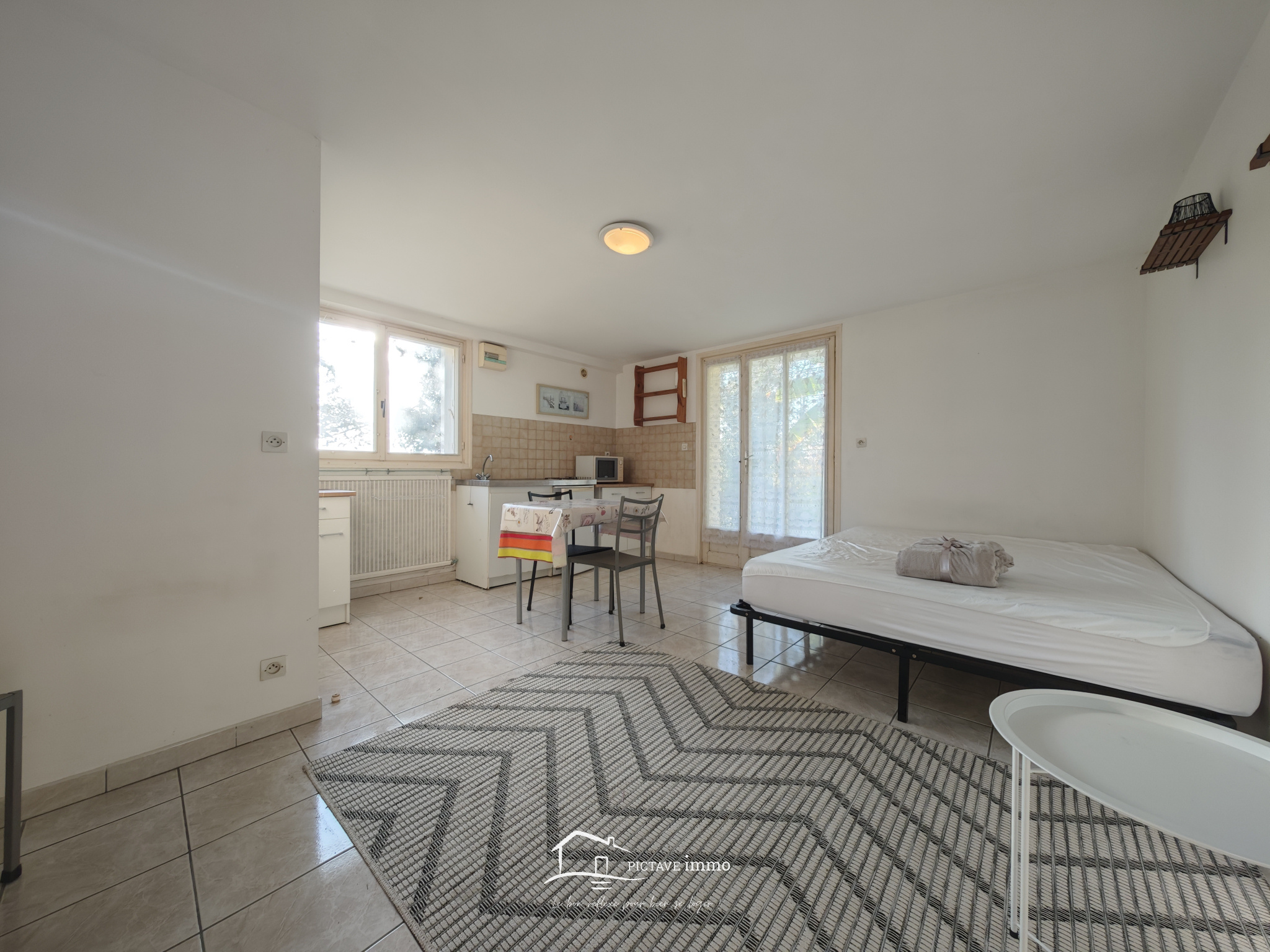 Ce studio offre une pièce de vie avec kitchenette et une salle d’eau avec WC.
