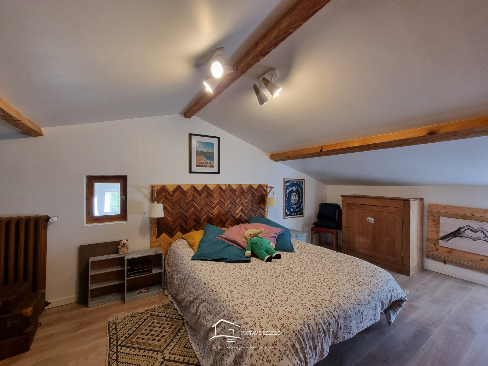 A l'étage : une chambre mansardée, une chambre et un grenier aménageable.